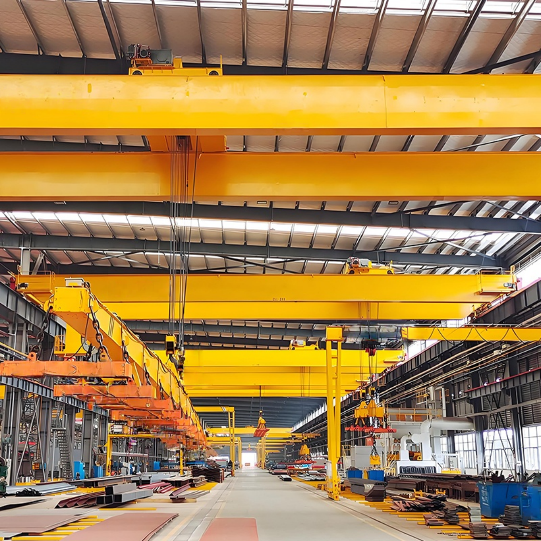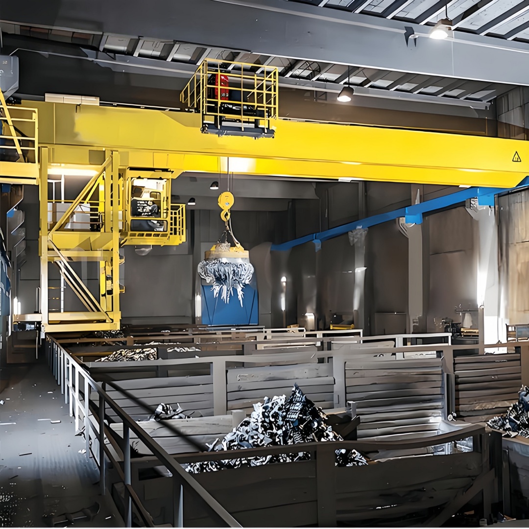 QC 型電磁橋式起重機(jī)是搭載電磁吸盤的橋式起重設(shè)備,以雙梁橋架為主體結(jié)構(gòu)(主梁與端梁連接成橋式框架),核心配置 “電動葫蘆 + 電磁吸盤” 起升單元;通過端梁沿廠房軌道的縱向運(yùn)行、小車沿主梁翼緣的橫向移動,結(jié)合電磁吸盤的 “勵磁吸附 / 退磁釋放” 動作,實(shí)現(xiàn)導(dǎo)磁性金屬物料(廢鋼、鐵錠、鋼坯等)的無捆扎快速吊運(yùn)。因其適配散料 / 工件的高效裝卸需求,已成為廢品回收、鋼鐵加工、機(jī)械制造車間的常用起重設(shè)備。