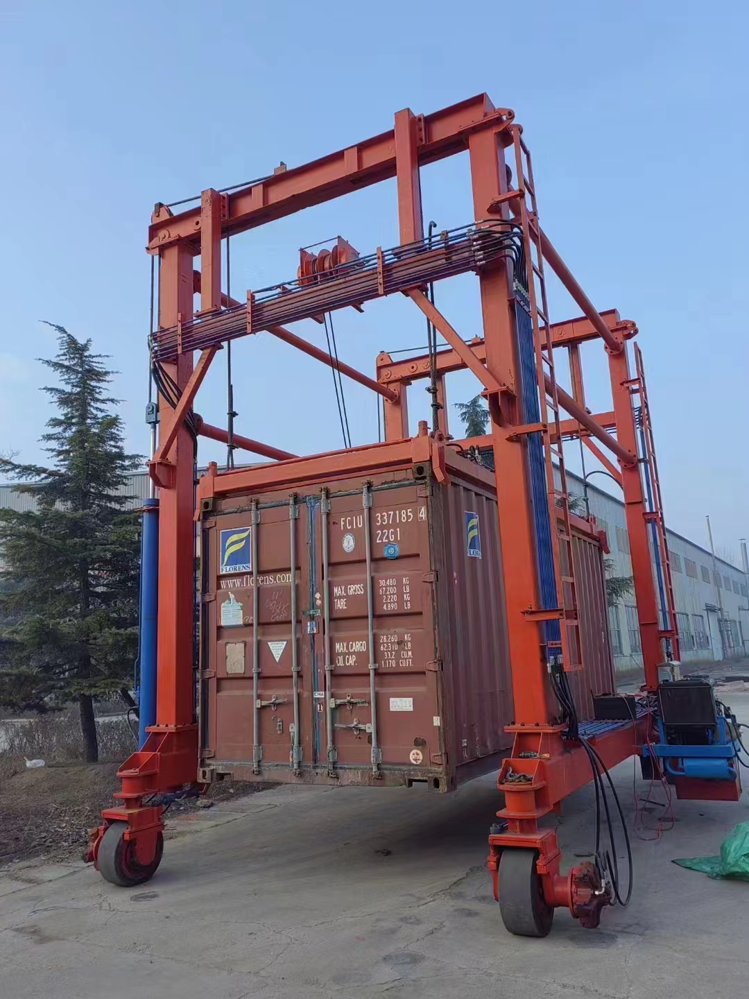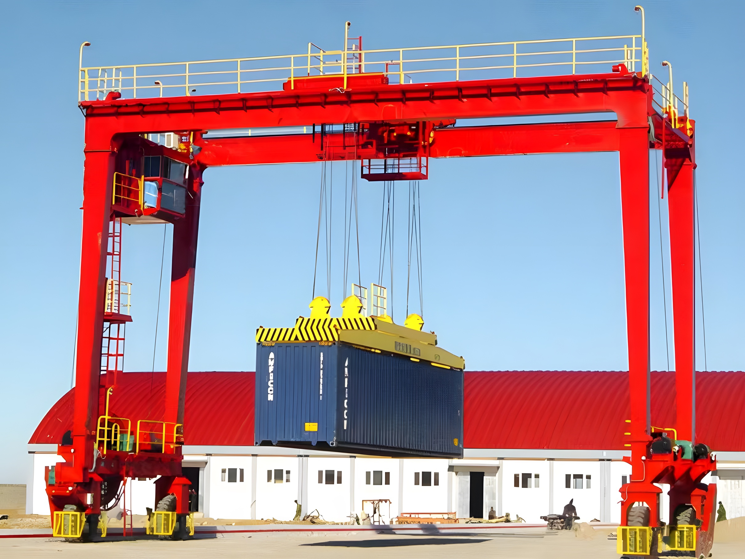 采用雙主梁箱型結構或桁架結構,主梁跨度覆蓋 6~8 列集裝箱加 1 條車道(常規(guī)跨度 20~30m),堆垛高度可達 4~7 層集裝箱 + 底盤車高度;門架兩側設有剛性支腿,保證整機穩(wěn)定性,部分機型配備柔性支腿,適應小范圍地面沉降。