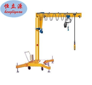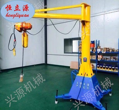 移動式旋臂起重機,它是一種可以移動的懸臂起重機。移動式懸臂吊更具靈活機動、適應性廣等特點,是自動生產線上必備的單獨應急吊裝設備,有了它能確保生產線暢通無阻。移動式旋臂起重機在300°的回轉懸臂的一端上配置環鏈電動葫蘆(或鋼絲繩電動葫蘆),用于對貨物或工件的起吊作業:另一端設置配重,與起重臂相對同時回轉,起平衡作用。廣泛適用于廠礦、車間、野外,倉庫小型設備安裝。貨物和工件裝卸,以及建筑低矮不宜架設行車等場所。